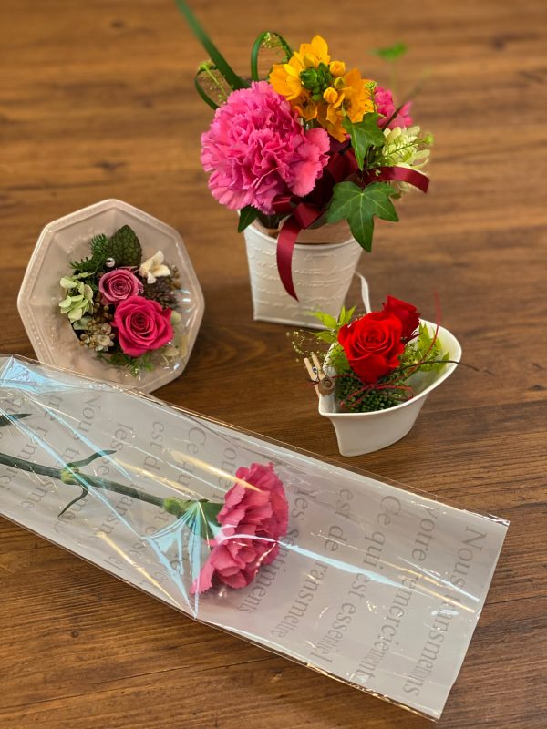母の日のプレゼントいろいろご用意しております。カーネーションの一本ラッピング、コートドールのケーキと一緒にいかがですか。